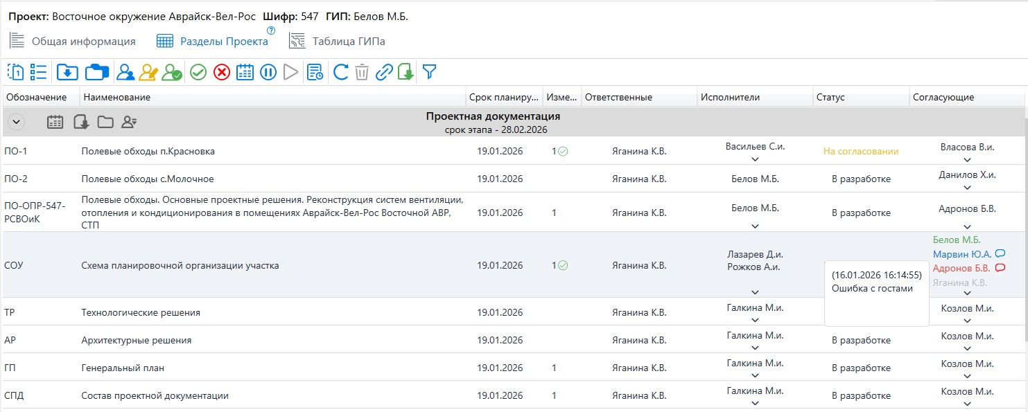 - если при согласовании или выдаче замечания оставлен комментарий, рядом с ФИО отображается значок сообщения.