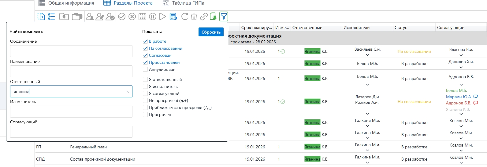 Реализован поиск по обозначению и наименованию комплектов, а также по ролям (ответственный, исполнитель, согласующий).